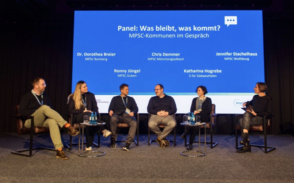 An zwei Tagen wurde wieder ein volles Programm mit Vorträgen, Podiumsdiskussionen und interaktiven Werkstätten geboten. Auch Projekte aus Südwestfalen konnten hier vorgestellt werden. Am ersten Tag wurde die Lösung „Erlebnis.Stadt“ aus Menden unter dem Punkt „Gold Nuggets“ auf der Bühne gepitcht. Katharina Hogrebe vertrat außerdem das Modellprojekt bei einer Podiumsdiskussion zum Thema „Was bleibt, was kommt?“, in der verschiedene MPSC-Kommunen, die in die letzte Phase des Projektes starten, in einen spannenden Austausch gingen. 🗣