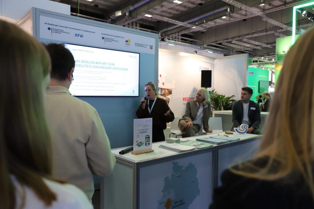 Am frühen Nachmittag gab es dann den ersten Impuls aus unseren eigenen Reihen zum Thema: „Zukunftsraum Südwestfalen: Mobil, smart, vernetzt im ländlichen Raum“ fand am Stand statt. In einem knapp 30-minütigen Vortrag stellte zuerst Sophie Lindenstruth (Stadt Soest) das Mobilitätsdashboard vor, das derzeit noch finalisiert wird, ergänzt von Pascal Helfer, von der NRW.Mobidrom GmbH, der die Mobidrom Datenplattform und die Produkte präsentierte.